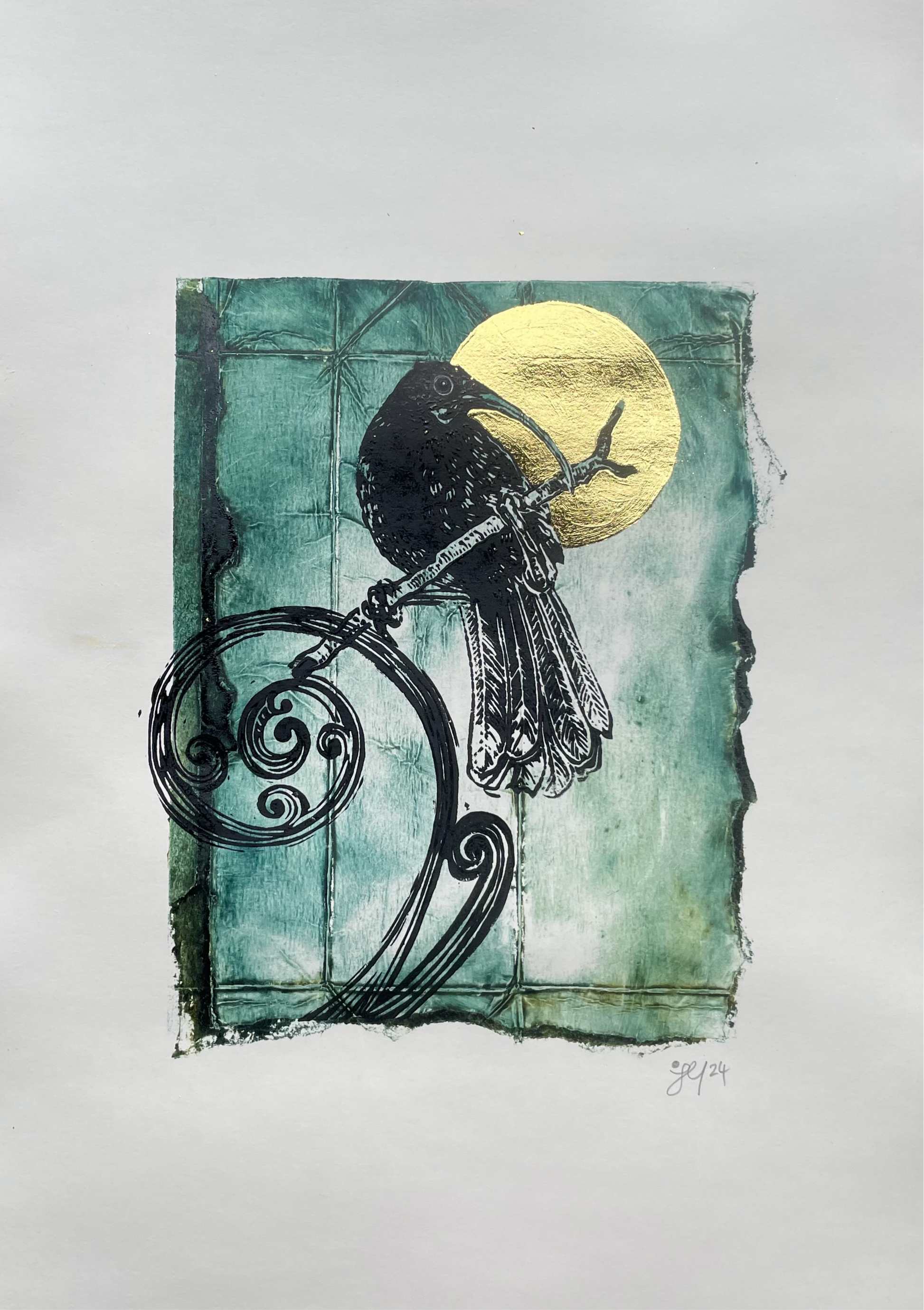 The Huia is a lino print on Tetrapak printed background. Gold leaf detail has been had applied to some of the series.